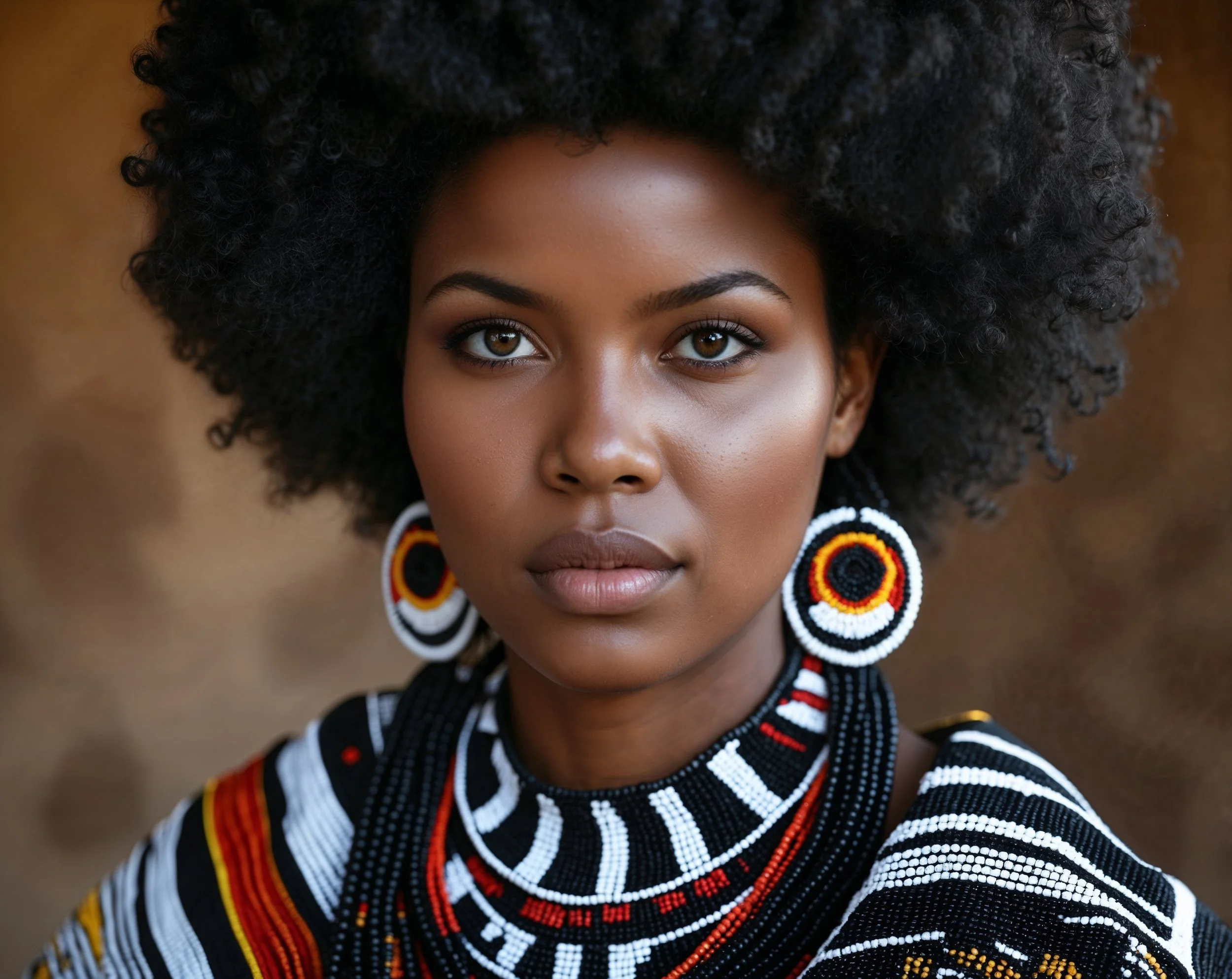 Cinematic portrait of a proud Xhosa woman with a rounded, curly afro. Wearing black and white traditional beadwork and garments. Close focus on her expressive face, defined curly hair texture, and intricate Xhosa patterns. Warm earthy background, soft natural lighting, detailed and authentic.