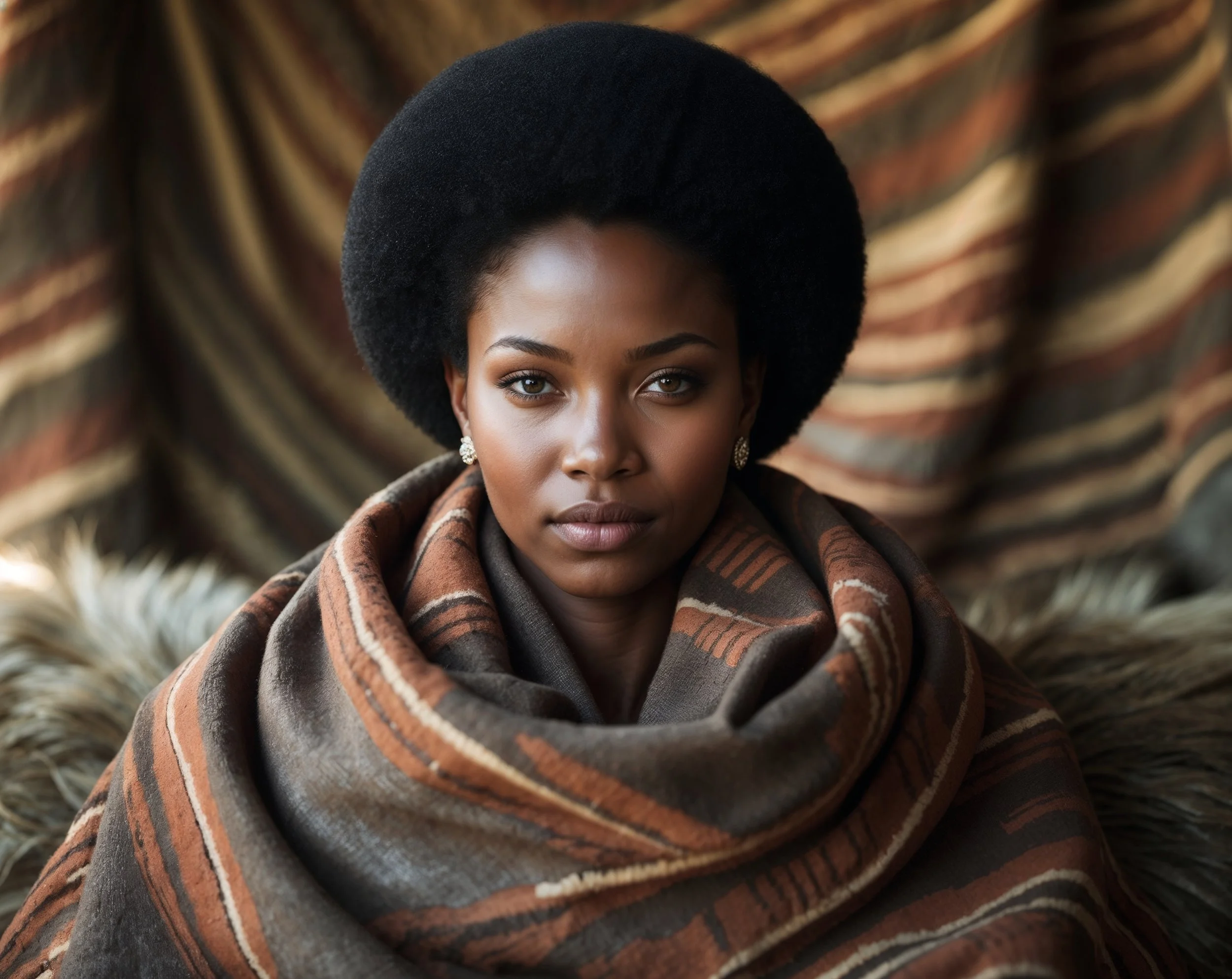 Cinematic portrait of a dignified Southern Sotho woman with a perfectly rounded natural afro. Wrapped in a Seanamarena Basotho blanket. Focus on her powerful face, even hair shape, and traditional blanket patterns. Muted earthy setting, soft sunlight, richly detailed and regal.