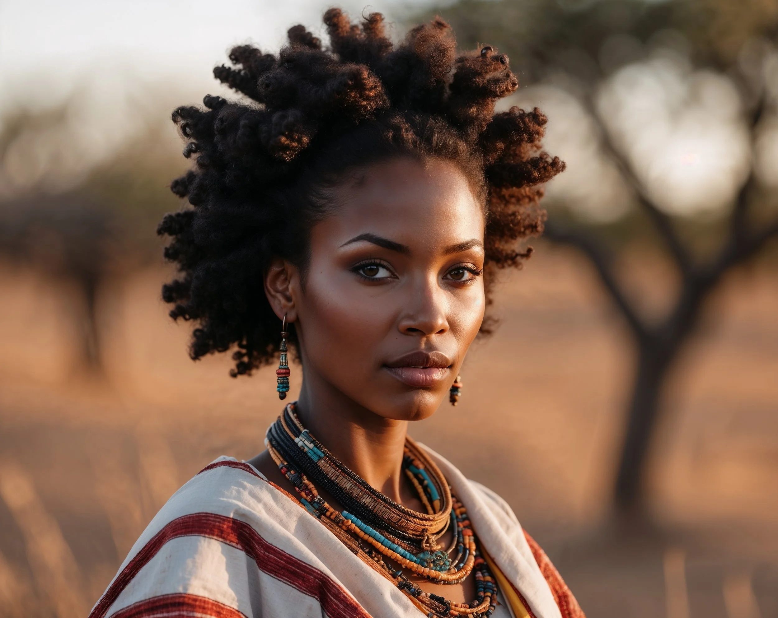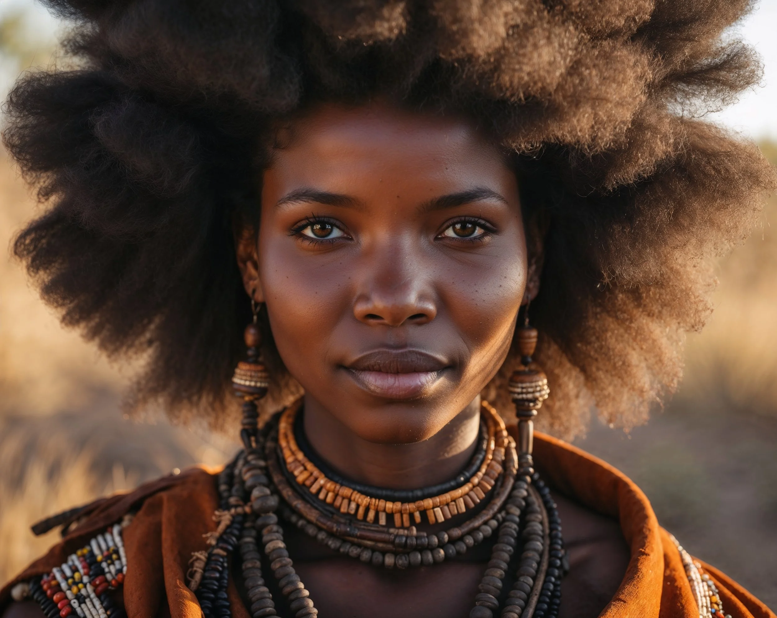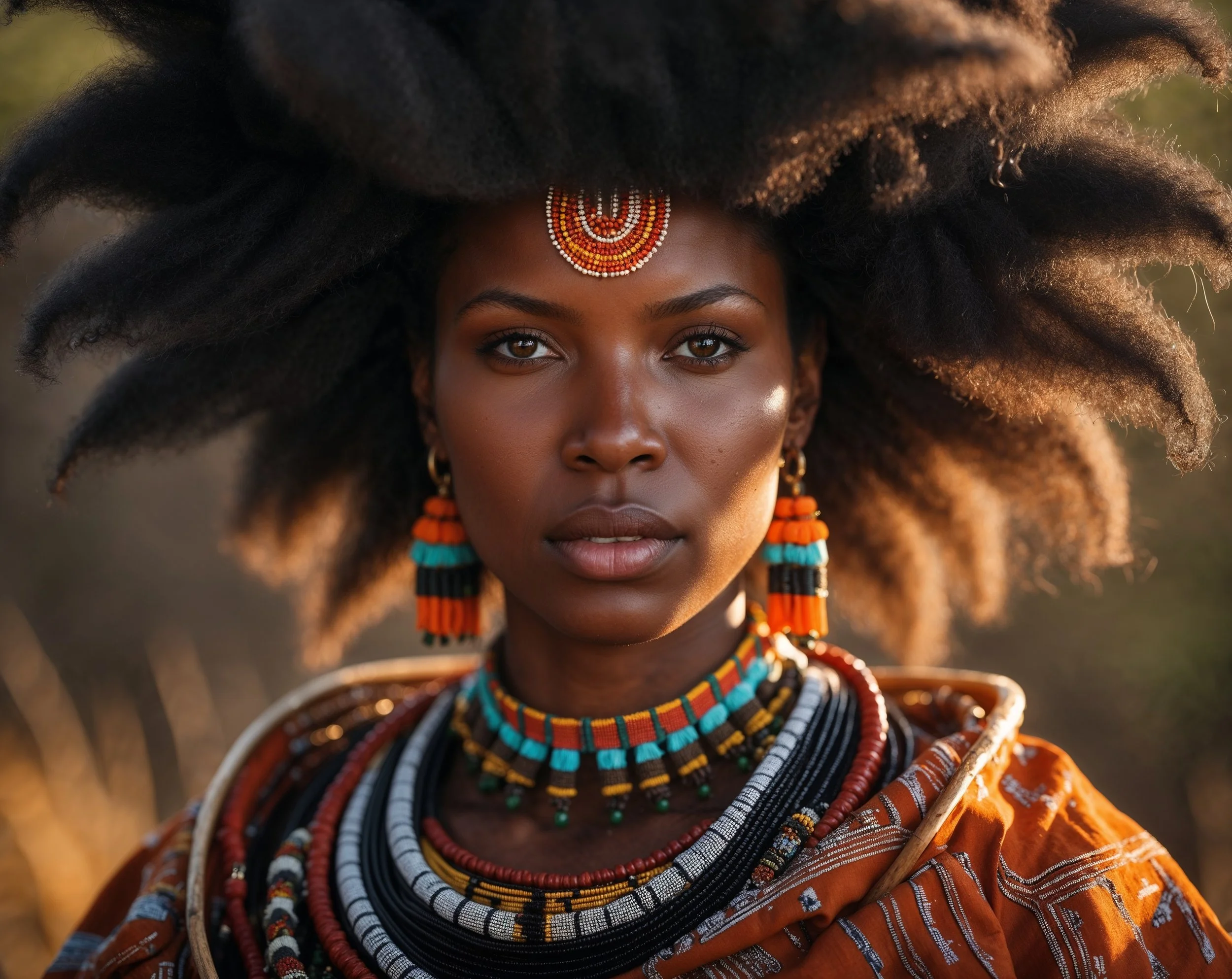 Cinematic portrait of a regal Zulu woman with a large, freeform afro. Focus on her powerful face, wild textured hair, and traditional Zulu beadwork and attire. Earthy, warm tones, golden-hour soft lighting. Rich fabric and jewelry details. Ultra-detailed, soft cinematic textures, proud and dignified.