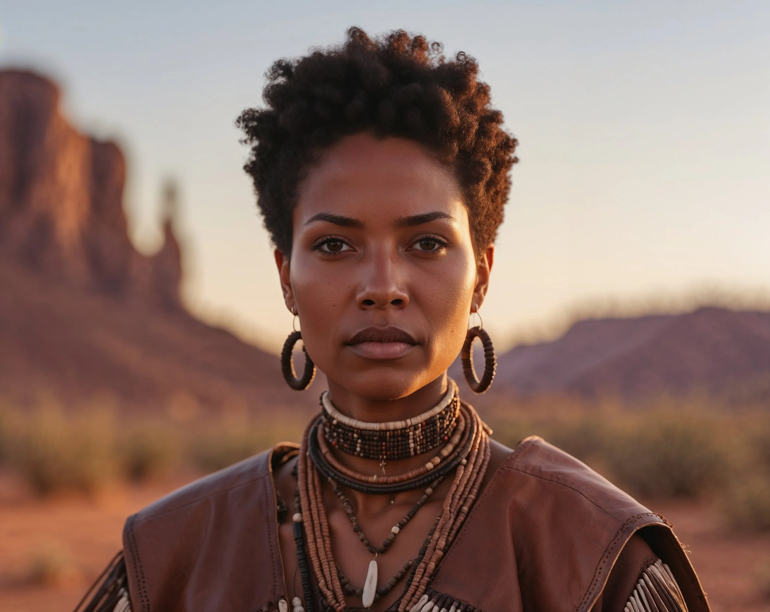 Soulful portrait of a San woman with a short, tight-coiled afro. Wearing traditional leather garments and minimalist beadwork. Sharp focus on her wise face, tightly coiled hair, and indigenous attire. Warm desert-inspired background, soft sunset light, earthy, powerful, and authentic.