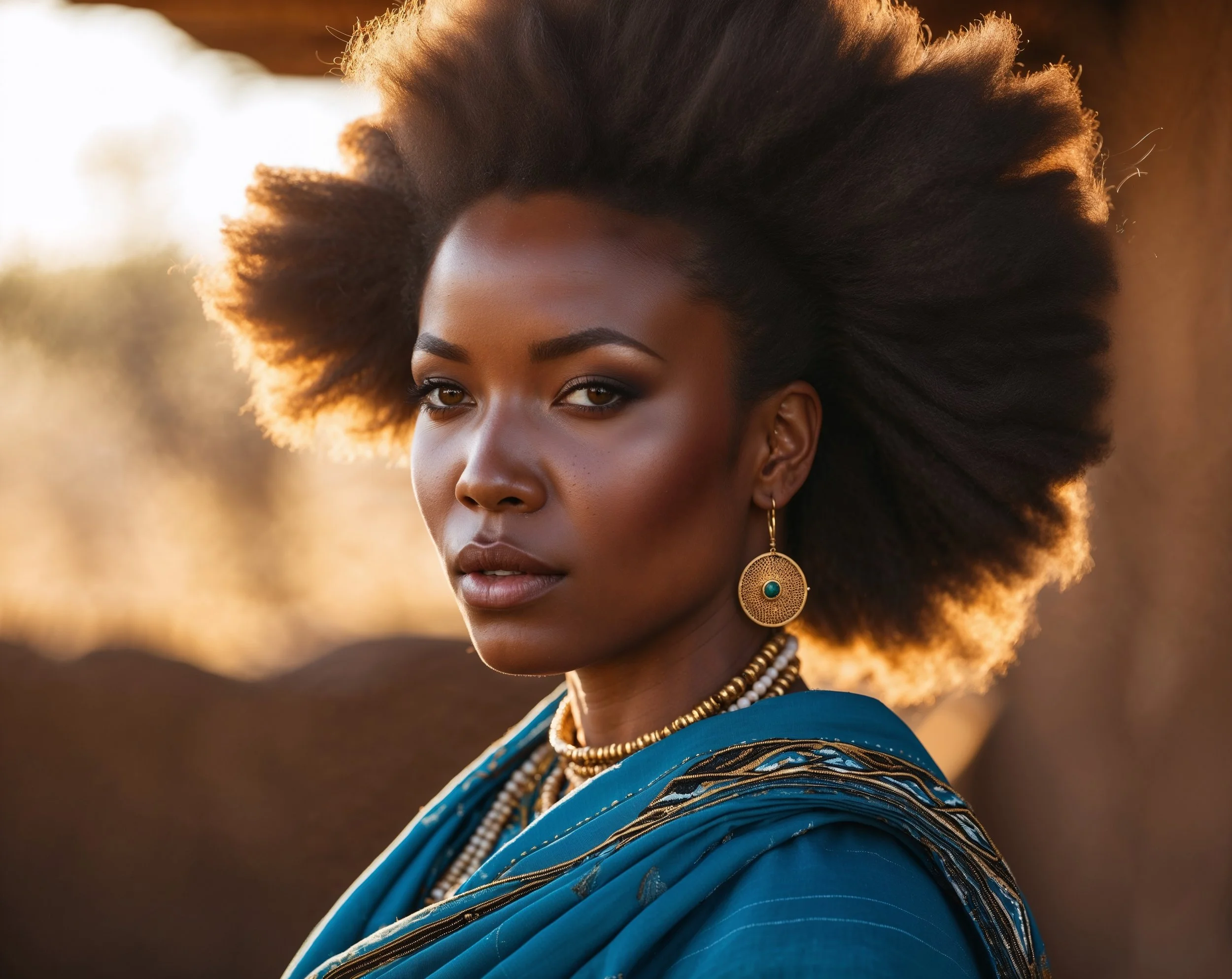 Warm cinematic portrait of a Tswana woman with a voluminous side-parted afro. Dressed in traditional blue shweshwe fabric and subtle jewelry. Strong focus on her radiant face, parted hair texture, and detailed fabric patterns. Earthy backdrop with golden light, rich storytelling vibe.