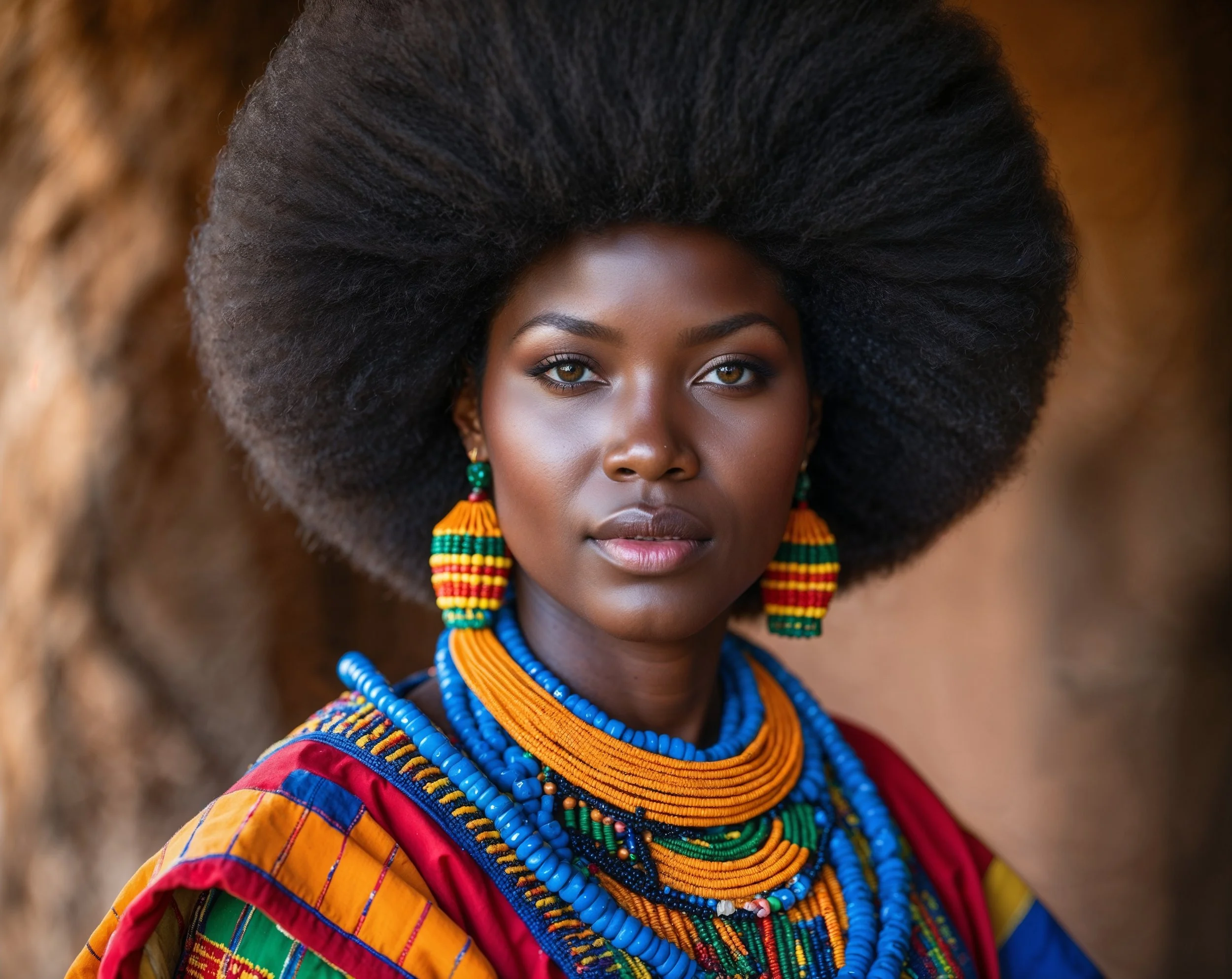 Vibrant portrait of a graceful Ndebele woman with a blown-out afro. Dressed in colorful, geometric-patterned traditional clothing with bold beaded neckpieces. Strong focus on her elegant face, stretched hair texture, and vibrant attire. Cinematic lighting, earthy tones, vivid yet grounded.